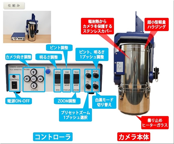 カメラは広角になっており、吊り下げ用のワイヤーがある近辺に専用の金具で下向きに固定します。このカメラからの映像を確認するモニターを運転席に取り付ければ使用できます。