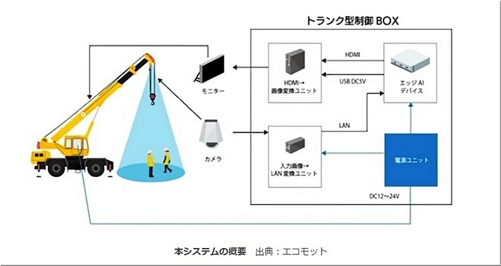 クレーンのブーム先端にカメラを取付け、運転席に取り付けたモニターで、映像をチェックできるので、フック周辺や地上作業の状態を把握し、安全性と作業効率の向上に用いられます。物と物の間に吊荷を降ろしていく際にも可視化でき作業が効率的に進みます。