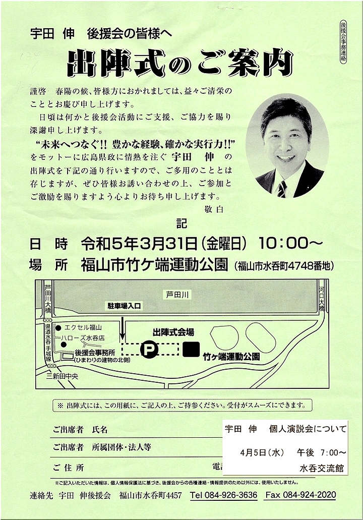 それはともかく、明日(3/31)A.M.10:00〜地元県議先生の出陣式が行われます。