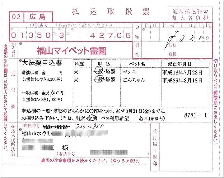 福山マイペット霊園≠ノは、2匹のごんchan≠葬っていますので、毎年春・秋の2回供養しているのですけど、山の中に眠っていますゴンchan達には申し訳なくて…