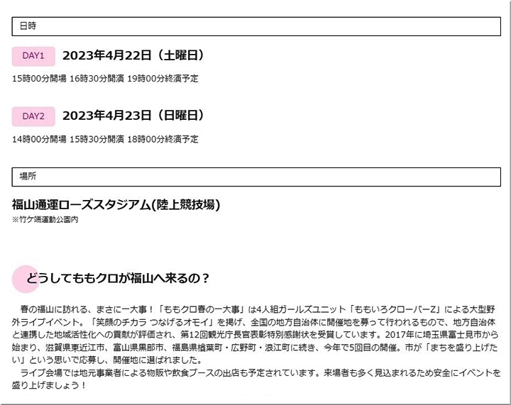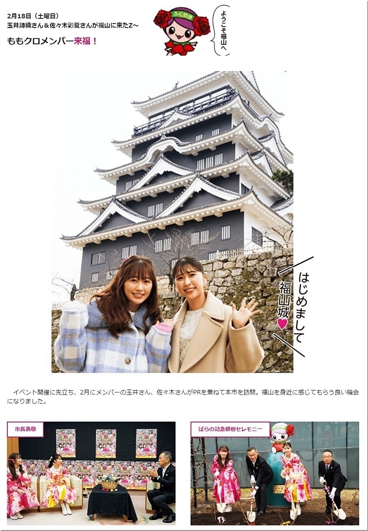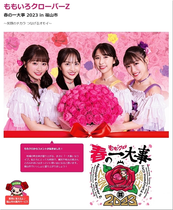 市の広報広報ふくやま4月号≠ノ、また「ももろいろクローバーZ春の一大事 2023 in 福山市=vの話題掲載が(^.-)☆