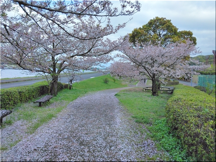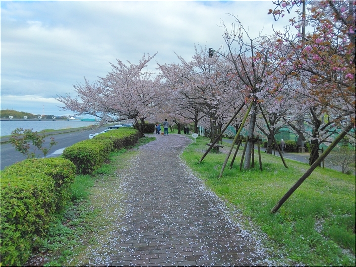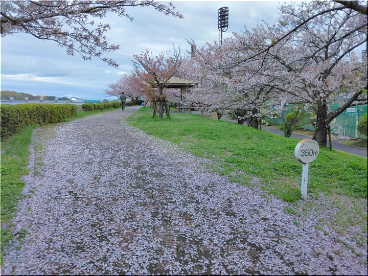 土手から運動公園ウォーキングロードのサクラ並木に入りますと、予期してはおりましたけど、降雨と風でサクラの花は随分散っておりました。