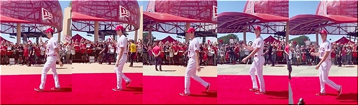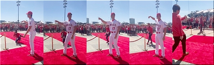 エンゼル・スタジアムの外に広げられたレッドカーペットの上を、世界の二刀流が闊歩する。周囲のファンに手を振る姿はまさにスーパースターだが、お茶目さも忘れない。道が二手に分かれた場所に差し掛かると「こっち?」「いや、こっち?」と言うように指差しながら立ち止まってキョロキョロ。最後は水原一平通訳がお助けに参上していた。