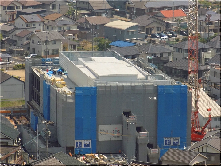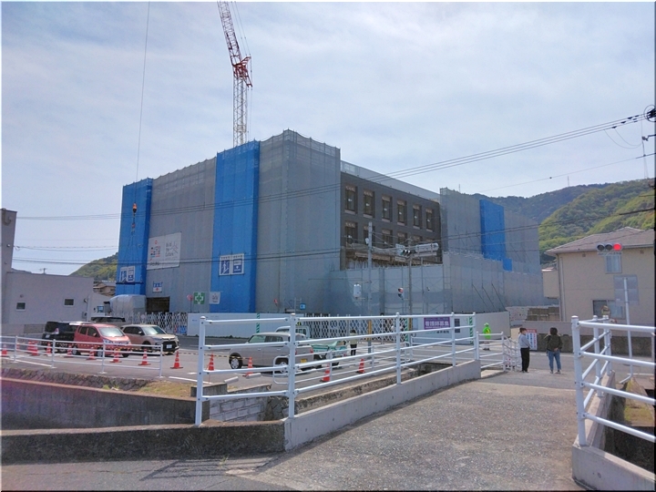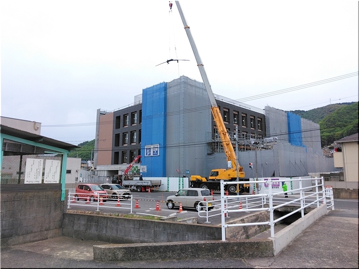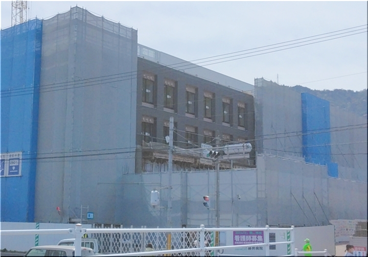 いつものように藤井病院建設現場に眼を向けますと、ふ〜ん、外観は、こんな感じなんですネ。工事用シートが外れ、一部外壁が出現です。