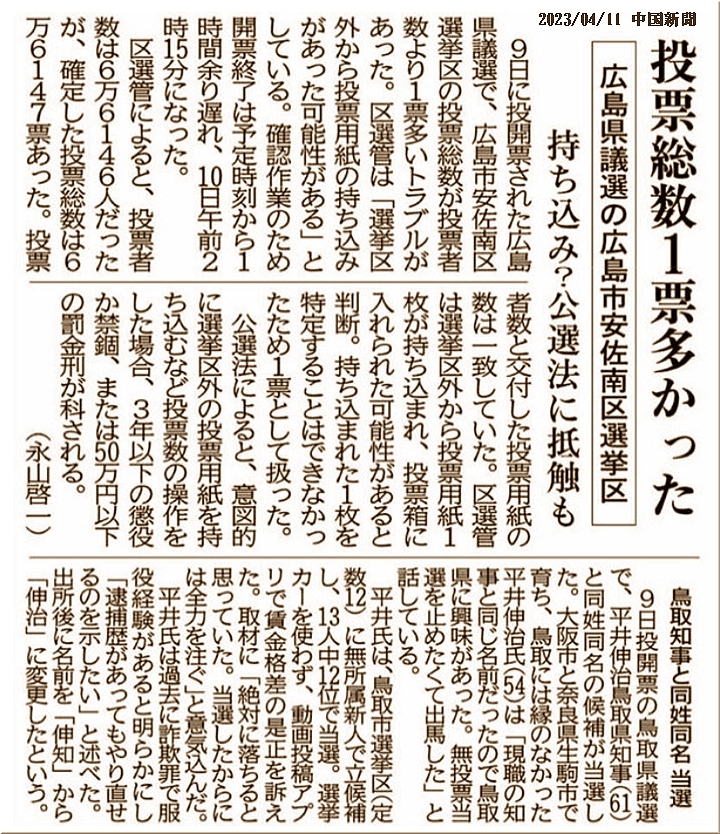 まず、広島市安佐南区選挙区の話題ですけど、4/9(日)投票で、開票結果は、投票総数が投票者数より1票多かったとか…