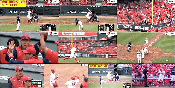 1:9番 九里 亜蓮 無死走者なし セカンドゴロ 1アウト、2:1番 菊池 涼介 一死走者なし 外角低めの真っ直ぐを打つもセンターフライ 2アウト、3:2番 野間 峻祥 二死走者なし ショートゴロ 3アウト