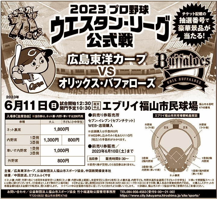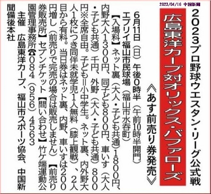 昨日の中国新聞朝刊紙面に、6/11(日)開催のウエスタンリーグ公式戦「広島×オリックス」戦の広告が…そぅでしたネ、6/11(日)には福山市民球場でウエスタン公式戦が(^.-)☆