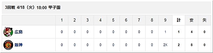 1:8番 木浪 聖也 無死走者なし ワンバウンドした球に空振り、三振を喫する 1アウト、2:9番 西 勇輝 一死走者なし 見逃し三振でバッターアウト! 2アウト、3:1番 近本 光司 二死走者なし センターへのスリーベース 3塁、4:2番 中野 拓夢 二死3塁 −広島:内野手マウンドへ集まる− 内角の真っ直ぐを打つもセンターフライ 3アウト