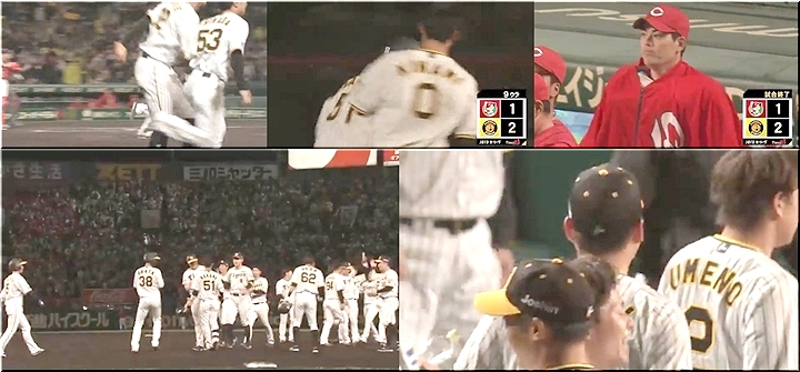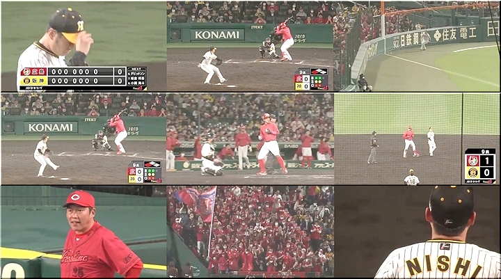 1:代打 糸原 健斗 無死走者なし ピッチャー ターリー に代わって 栗林 がマウンドにあがる 守備交代:ファースト 韮澤 守備変更: 矢野 →ショート 守備変更: 小園 ショート→サード 島田 →代打: 糸原 見逃し三振でバッターアウト! 1アウト、2:7番 梅野 隆太郎 一死走者なし ライトへのヒットで出塁 1塁、3:8番 木浪 聖也 一死1塁 1塁 梅野 →代走: 植田 ライトへの二塁打 2,3塁、4:代打 渡邉 諒 一死2,3塁 西勇 →代打: 渡邉諒 2塁 木浪 →代走: 小幡 見逃し三振でバッターアウト! 2アウト、5:1番 近本 光司 二死2,3塁 −広島:内野手マウンドへ集まる− 満塁策で敬遠される 満塁、6:2番 中野 拓夢 二死満塁 2アウト満塁の2-2からレフトへのタイムリーツーベースで阪神逆転サヨナラ勝ち! 神2-1広