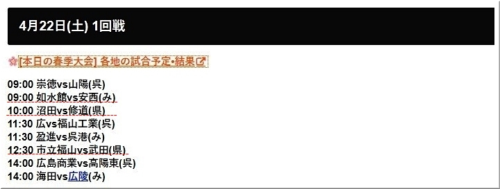 ところで、先週・4/15(土)に、福山市民球場で行われる予定でした広島県春季高校野球の「如水館×安西」「沼田×修道」「市立福山×武田」の3試合、降雨で4/22(土)に順延となりましたけど、球場はバルコムBMW≠ニみよし運動公園≠フ2球場に分散して開催のようであります。