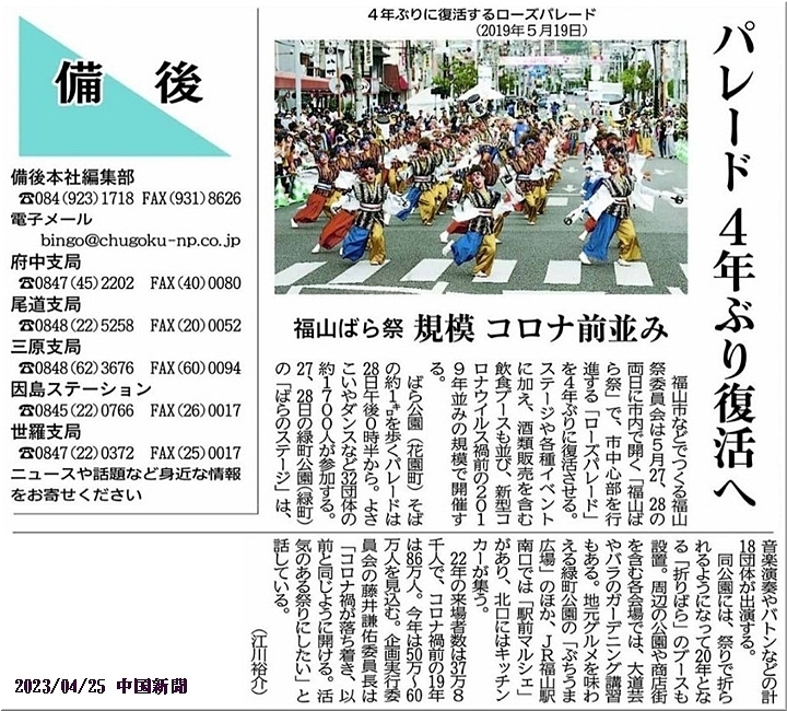これは、4/25付け中国新聞朝刊記事なんですけど、ふん、ふん、ローズパレード≠ェ4年振りに復活ですか…