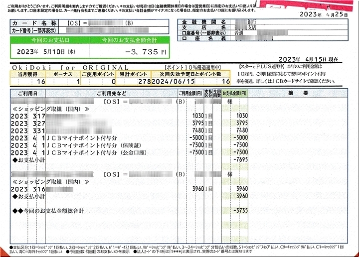 いつものように開封しますと、請求額が『-3,735円』には、なぬっ、JCBからの請求額が-3,735円!?…と、一瞬、戸惑うGONsanでした(^-^;