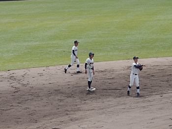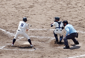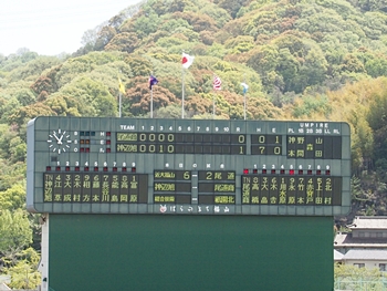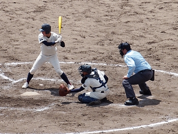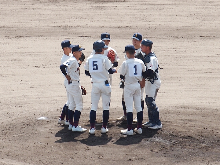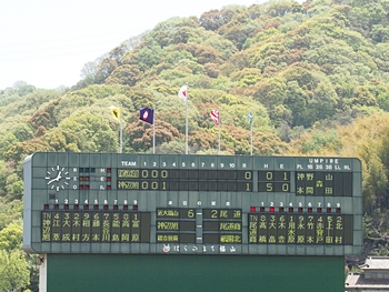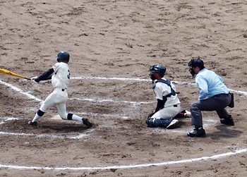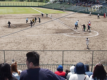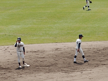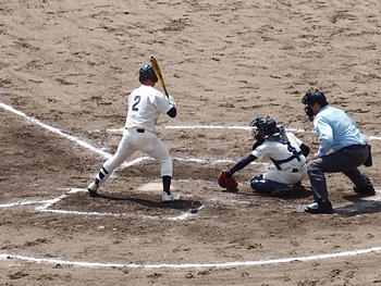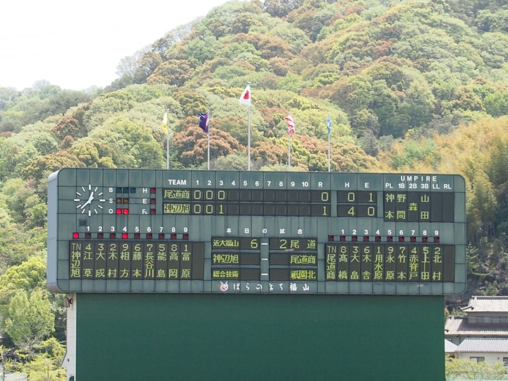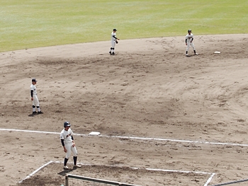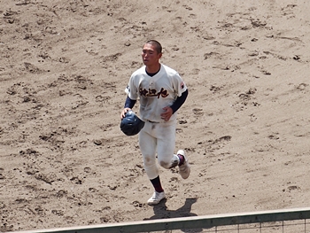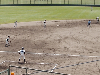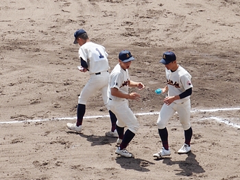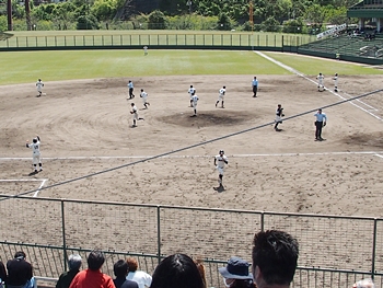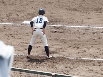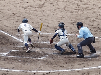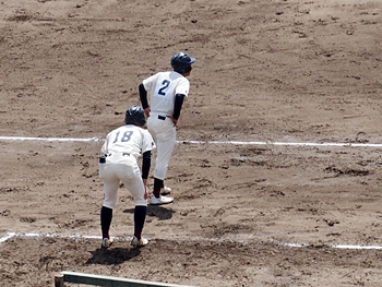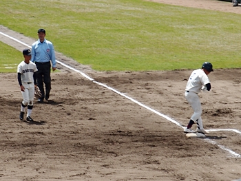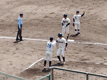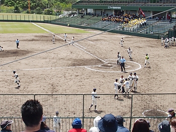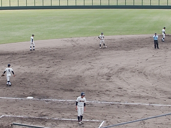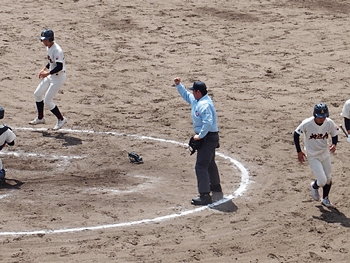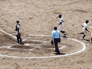 対する尾道商は4回表も無得点。その裏の神辺旭、2アウト2塁で追加点のチャンス到来。外野へのヒットで3塁ベースを廻りホームへと強行。でも、微妙なタイミングでアウト(^-^;