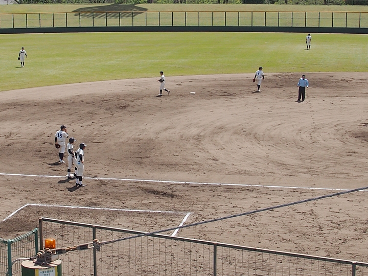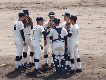 内野手がピッチャーマウンドに集まり、監督からの伝令の確認。神辺旭のピンチですけど、さて、この1点で乗り切る事が出来ますでしょうか…