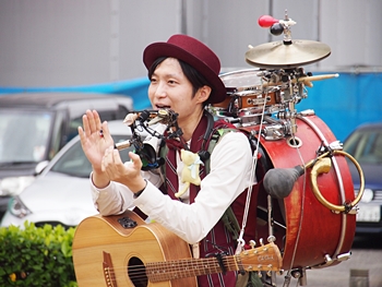 続いて中央公園に向かいますと、油井ジョージ ワンマンバンド≠ェ熱演中。いつ拝見しましても、楽しいですネ(^.-)☆
