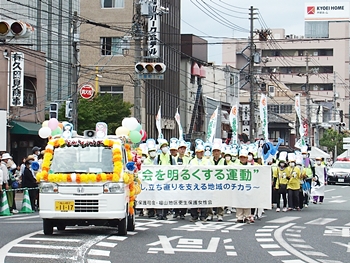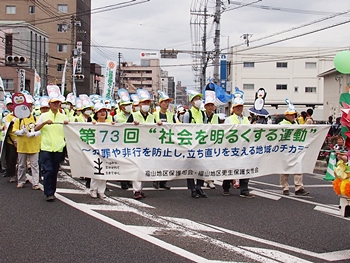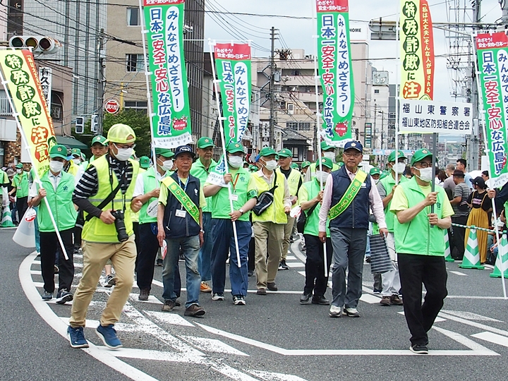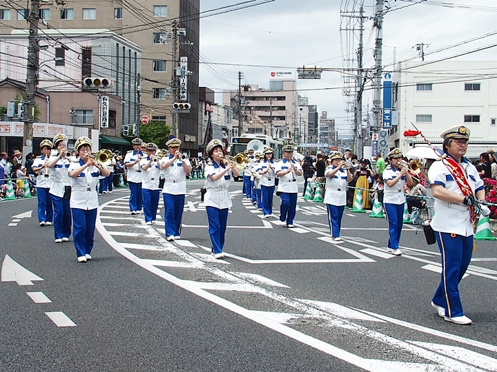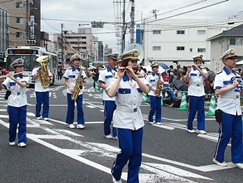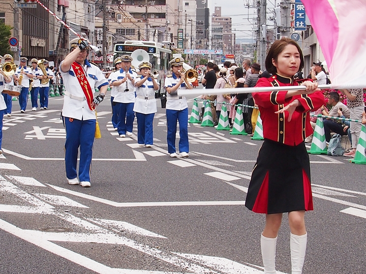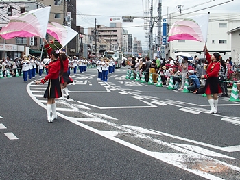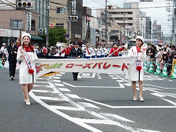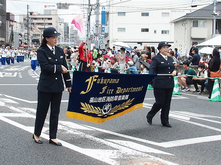 パレードの先頭で横断幕を持っています前年度のローズ福山(旧ミスばら)≠フお二人に続いて、福山地区消防局音楽隊≠フ皆さんです。