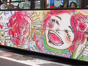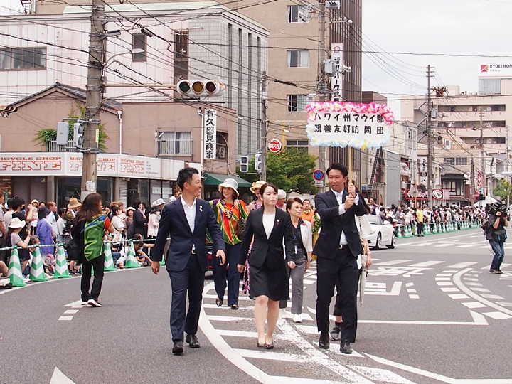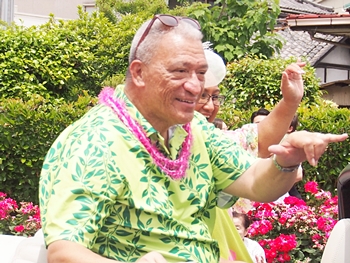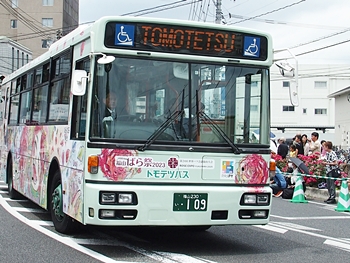 この音楽隊に挟まれて「バスデザインコンテスト入賞」のばらバス≠ェ…そして、バスの後方にハワイ州マウイ郡親善友好訪問団≠フ皆様です。