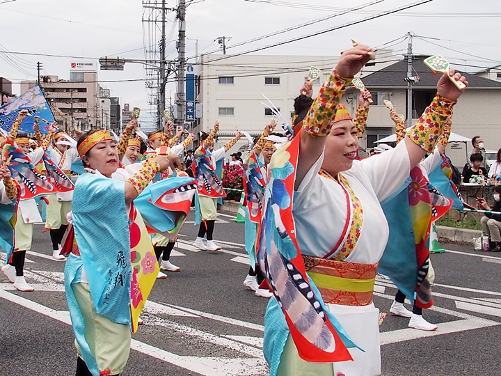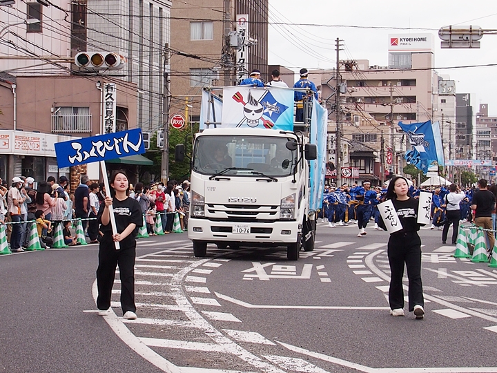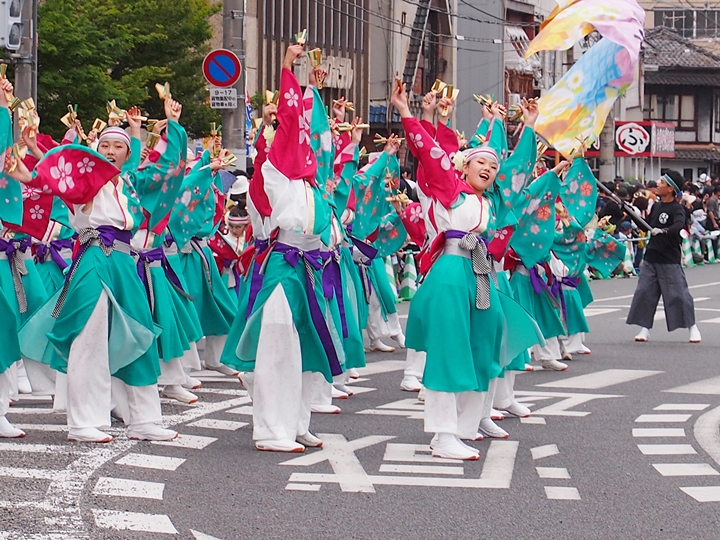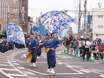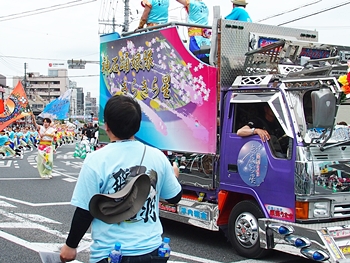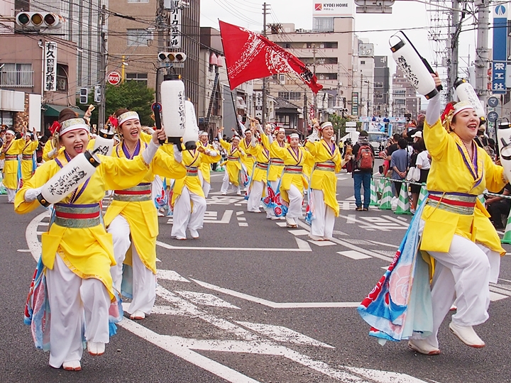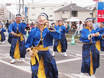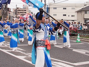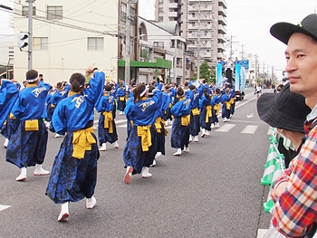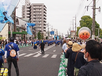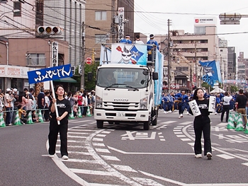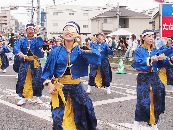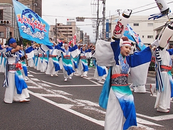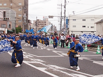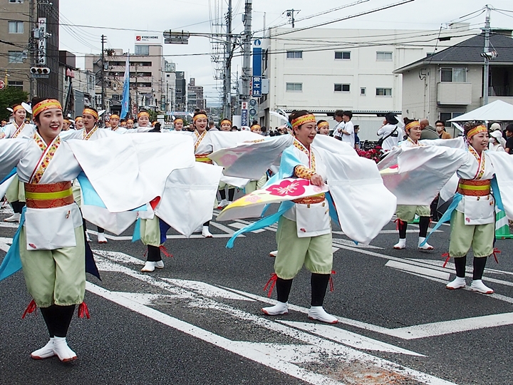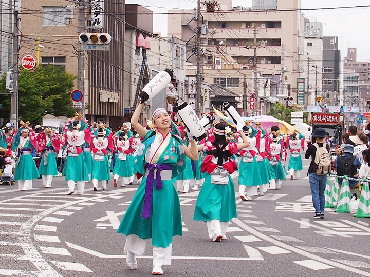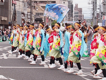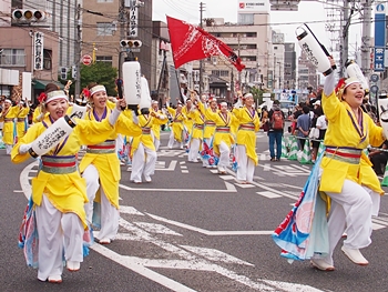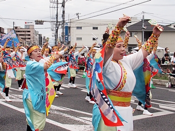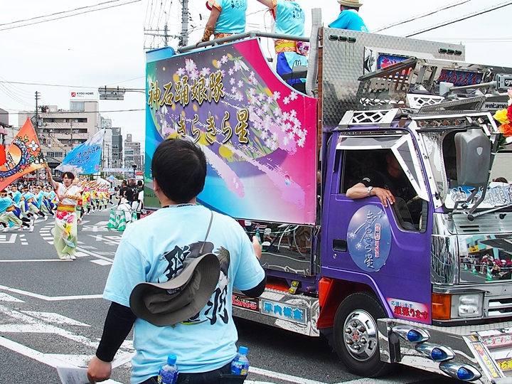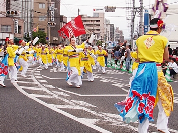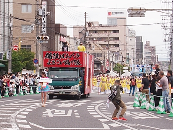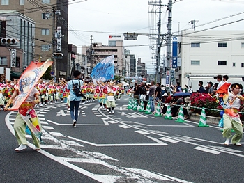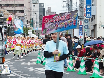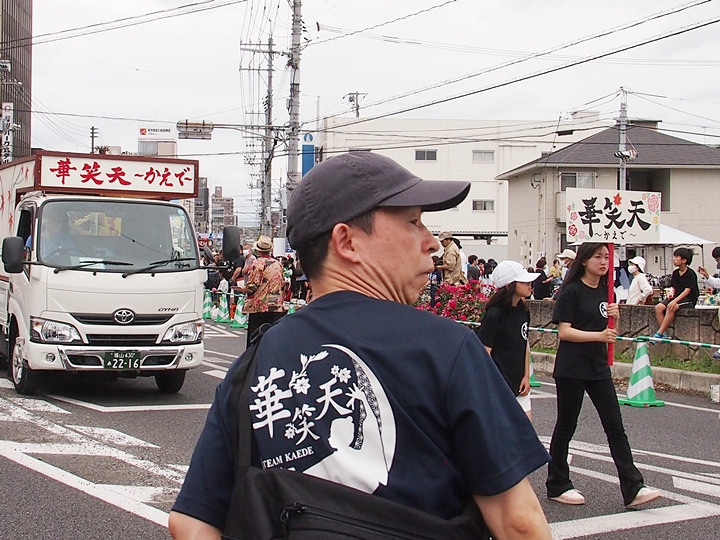 神石踊娘隊きらきら星≠フ皆さんが通過しますと、後方には、華笑天〜かえで〜≠フ皆さんです。