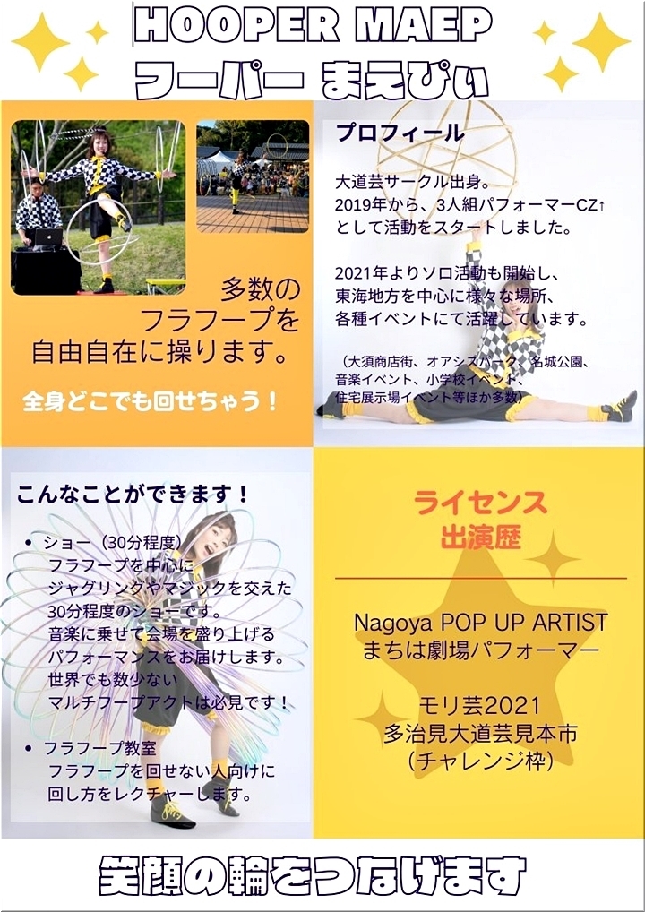 大道芸サークル出身--2019年から、3人組パフォーマーCZ↑として活動をスタートしました。2021年よりソロ活動も開始、東海地方を中心に様々な場所、各種イベントにて活躍しています。