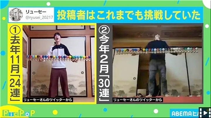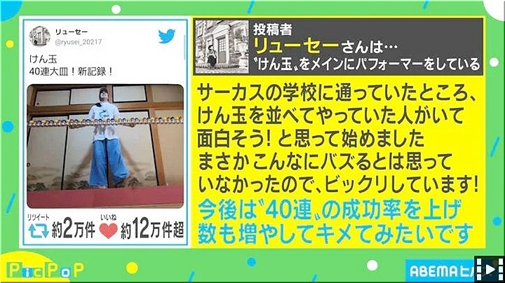 ニュース番組「ABEMAヒルズ」では、リューセーさんを取材。リューセーさんは“けん玉”をメインに活動しているパフォーマーで「サーカスの学校に通っていたところ、けん玉を並べてやっていた人がいて面白そう!と思って始めました」とコメント。反響について「まさかこんなにバズるとは思っていなかったので、びっくりしています!」と語っている。また、今後は「“40連”の成功率を上げ、数も増やしてキメてみたいです」とのこと。