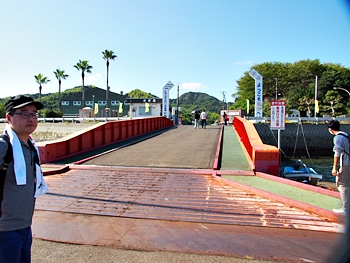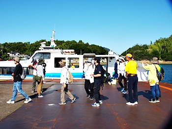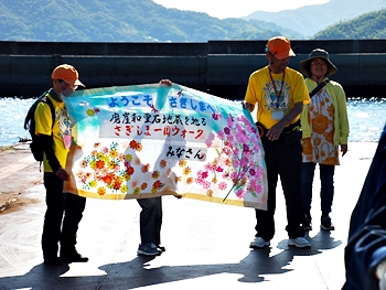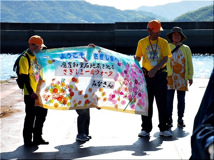 丁度、所要時間15分で佐木島≠ノ到着です。桟橋では、今回のさぎしま一周ウォーク≠フ主催者の皆様が、華やかな横断幕で迎えて下さいましたネ(^-^)//"