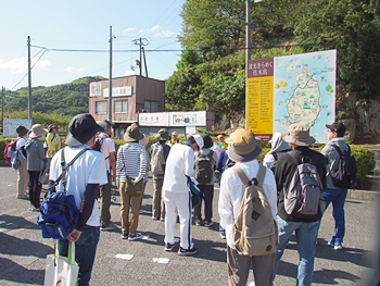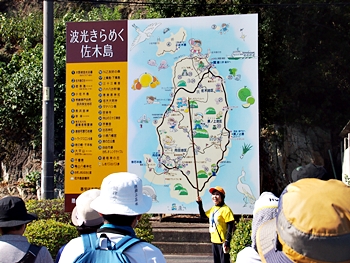 鷺港の駐車場に設けられましたさぎしまガイドマップ≠見ながら、さぎしまを愛するボランティアガイド≠フ土田会長sanが、本日のウォーキングコースをご説明です。