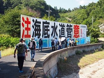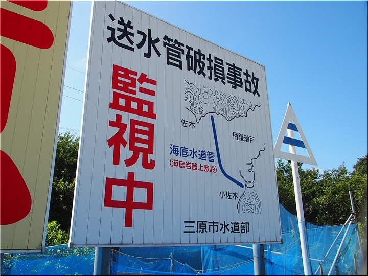 暫く進みますと、今度は『海底水道管注意』『送水管破損事故 監視中 三原水道部』の大きな看板が(^.-)☆