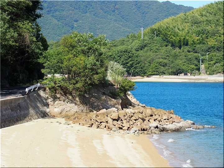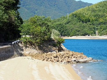この海岸の砂浜は大変に広くて長く、瀬戸内海の多くの島の中でも、自慢できる素晴らしい砂浜です。海水浴や砂浜ウォーキングにも最適で、近くに公衆トイレも設置されています。