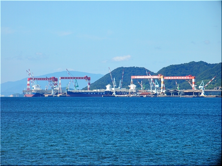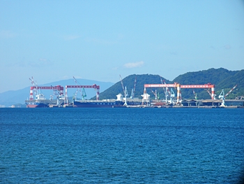 ここで、暫し休息です。長浜海岸から正面(西方)方向の三原市幸崎に眼を向けますと、今治造船広島工場のドックが(^.-)☆