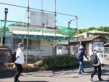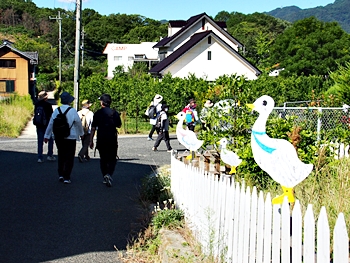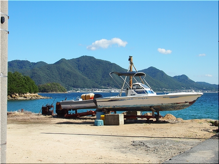 青々として美しい瀬戸内に眼を向けながら皆さんの後方を歩いておりますと、こじんまりとした住居が何棟か…使用されて無いようですけど、ちゃんと手入れはされております。