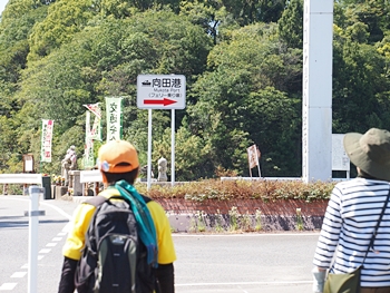 サギ・セミナー・センター≠ゥら少し先には、『向田港(フェリー乗り場)』の案内表示が…ヤッと向田港に到着です。