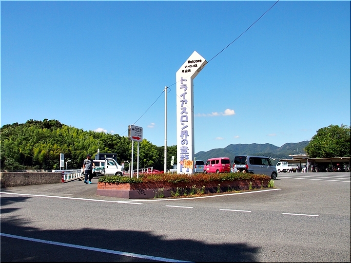 向田港の左手には、鷺浦コミュニティセンター≠フ建物が。向田港の駐車場には、「トライアスロン界の登竜門」の大きな表示が(^.-)☆