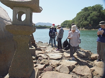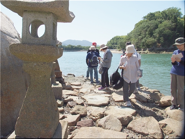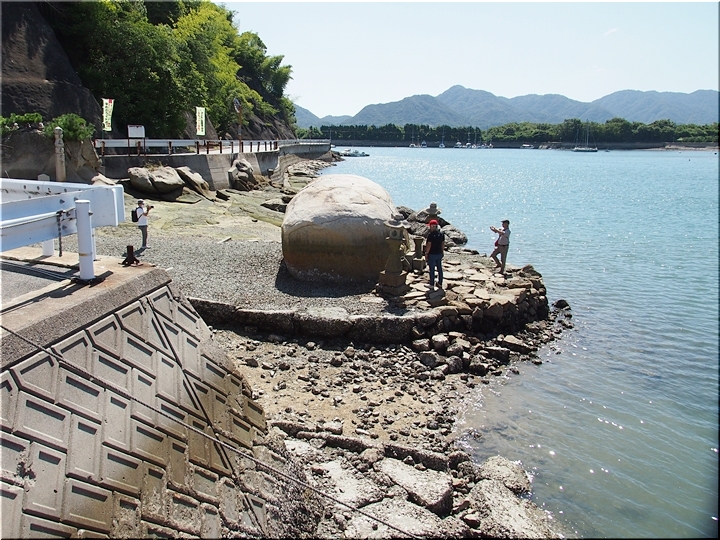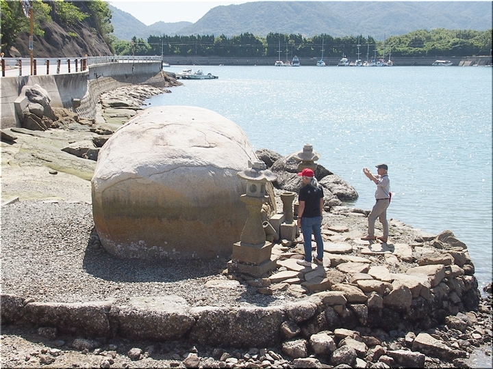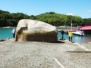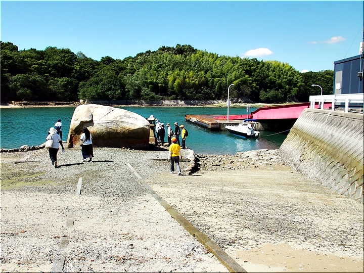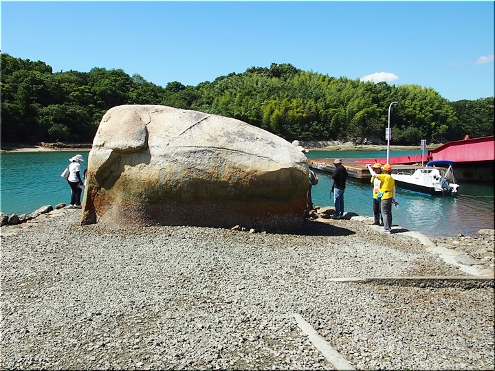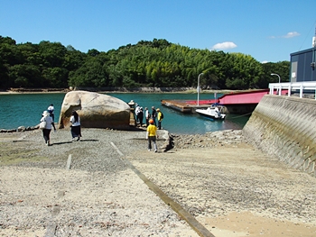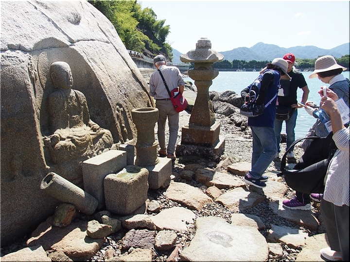 三原港の桟橋が見えなくなったと思ったらもう向田港に到着。瀬戸内の波の穏やかな海、わずか15分足らずの乗船であった。驚いたことに、土地の人に聞いてもその所在が分からず、気をもんだ磨崖仏の刻まれた巨岩が、桟橋の直ぐ脇の砂浜に見えていた。案ずるより生むがやすしの諺を実感した。