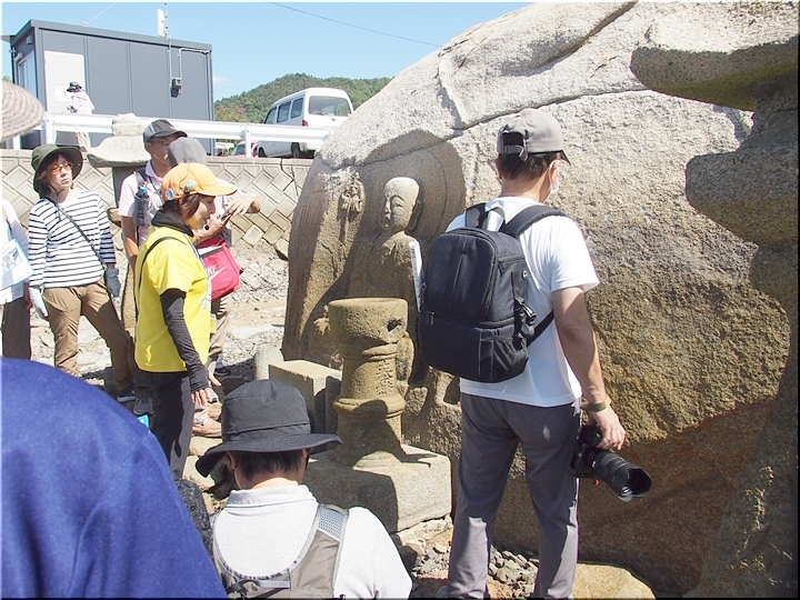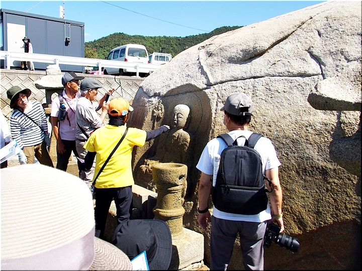 向田港桟橋横では、本日の佐木島一周ウォーク≠フ目的の一つで有ります『磨崖和霊石地蔵』を見学です。磨崖和霊石地蔵°゚くの道路脇には「広島県重要文化地蔵」を説明した石碑が…