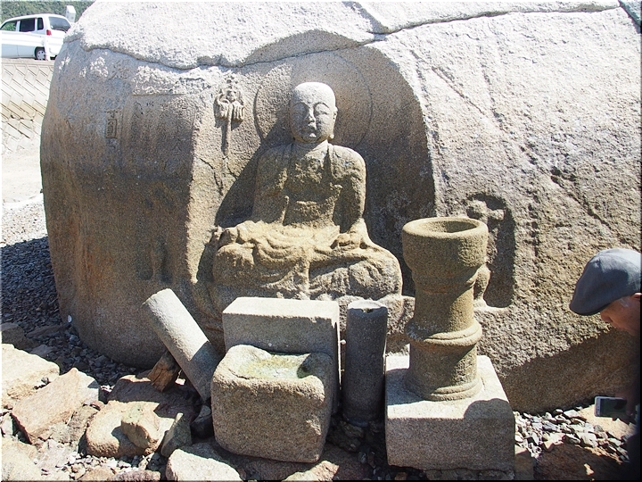 磨崖和霊石地蔵は、佐木島向田港フェリー到着場のすぐ横の海中に鎮座しています。波打際の独立した巨岩の中央の蓮華座の上に舟形の輪郭を彫り沈め、その中に地蔵坐像が彫られています。