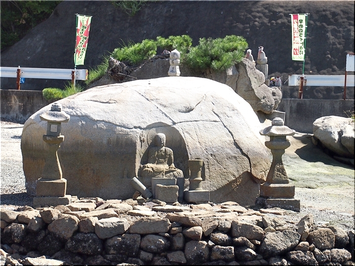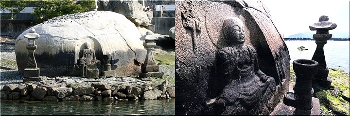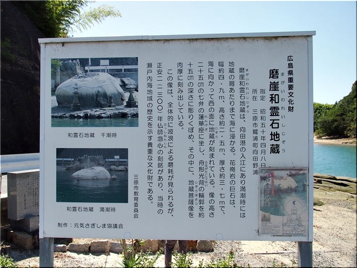 磨崖和霊石地蔵は、向田港の入江の入口にあり、満潮時には地蔵の肩あたりまで海に浸かる。花崗岩の巨岩は、幅4.9m、高さ2.5m、厚さ3.7mで、海に向かって西の面に地蔵が刻まれている。