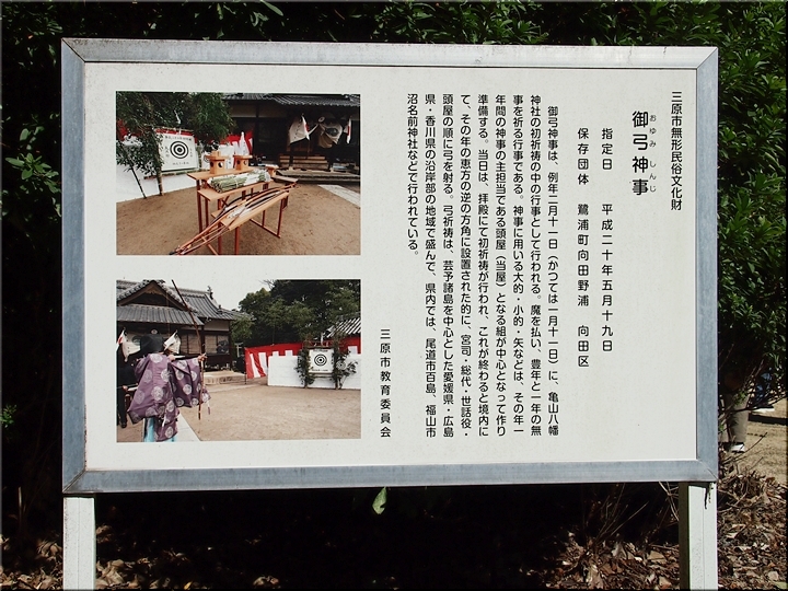 周辺を見廻しますと、説明板が…「西原庄藏翁」の説明でなく「御弓神事」の説明板でありました。