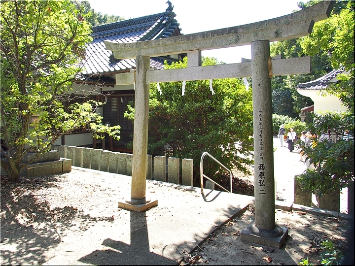 西原庄蔵(にしはらしょぞう)は、1832年に佐木島の西にある割石島(わりいしじま)との間の干拓に着工し、1834年には扇浜塩田(おうぎはまえんでん)を完成させるなど、多くの偉業をなした人物で、その功績に対し神社境内に西原庄蔵翁頌徳碑(にしはらしょうぞうおうしょうとくひ)が建てられており、毎年10月に「頌徳祭(しょうとくさい)」が行われています。そんな歴史のある亀山八幡神社は地域に根ざした神社として愛されています。