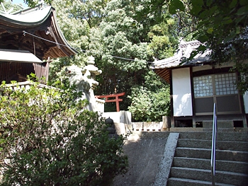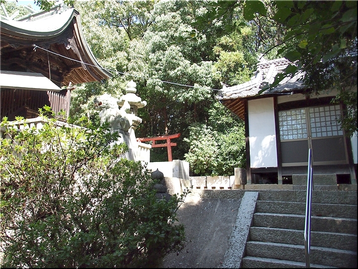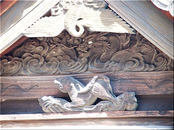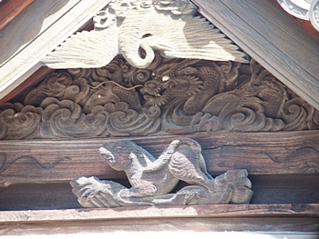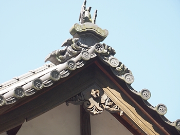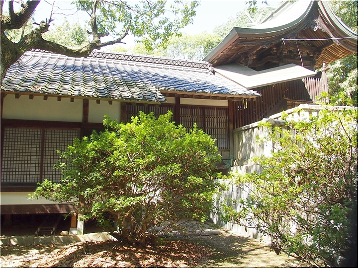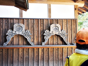 拝殿・本殿の周りをグルッと廻って境内に戻って来ますと、境内端の建物の軒下に鬼瓦が二体置かれております。