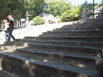 社紋は石清水八幡宮と同じ「左三つ巴」の紋が使われています。広い石段と両サイドの34基の燈籠は、非常に立派です。