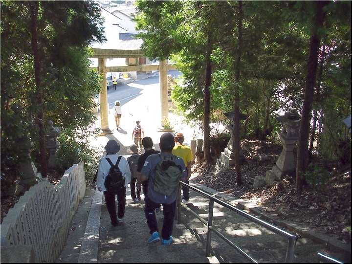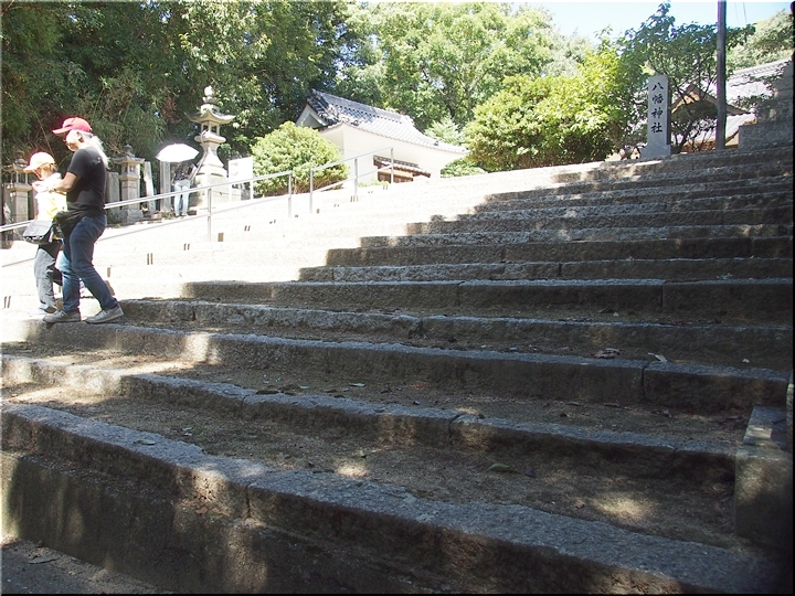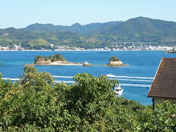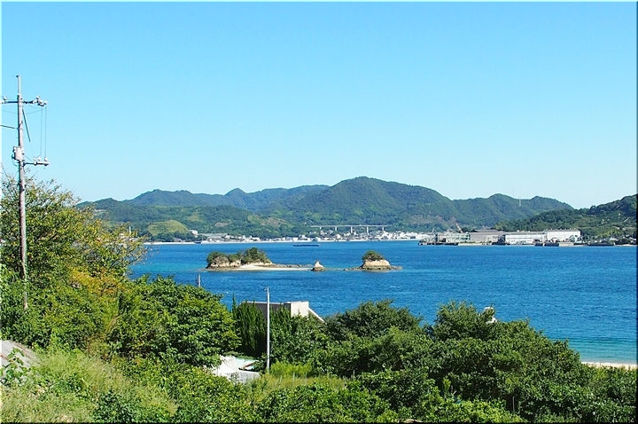 それでは、亀山八幡神社≠ニお別れですけど、石段を下り鳥居へと下っておりますと、鳥居の前方方向に青々とした瀬戸内が…そぅそぅ、こんな記載もありました。