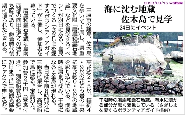ふ〜ん、三原市の離島・佐木島を歩いて1周し、県重要文化財「磨崖和霊石地蔵」などを見学するイベントが、9/24(日)に開催との事。