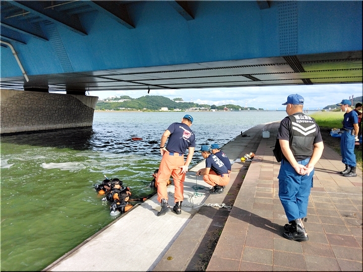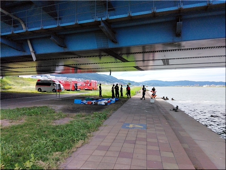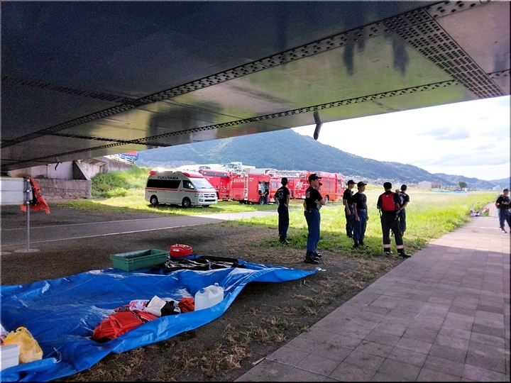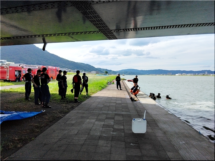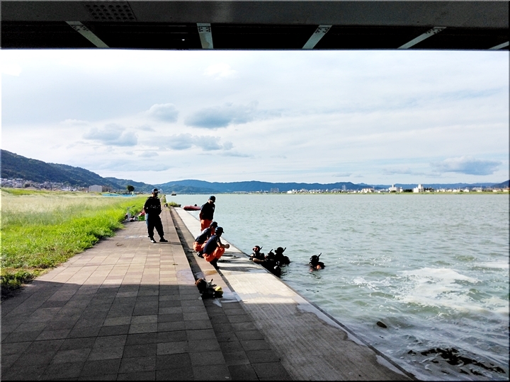 昨日(9/23)・土曜日の夕方近く、P.M.4:30頃からウォーキング開始のGONsanで、いつものようにエクセル裏から河川敷に降りますと、芦田川大橋下では福山消防の皆様が、アクアラングを使用して水難救助訓練を(^.-)☆