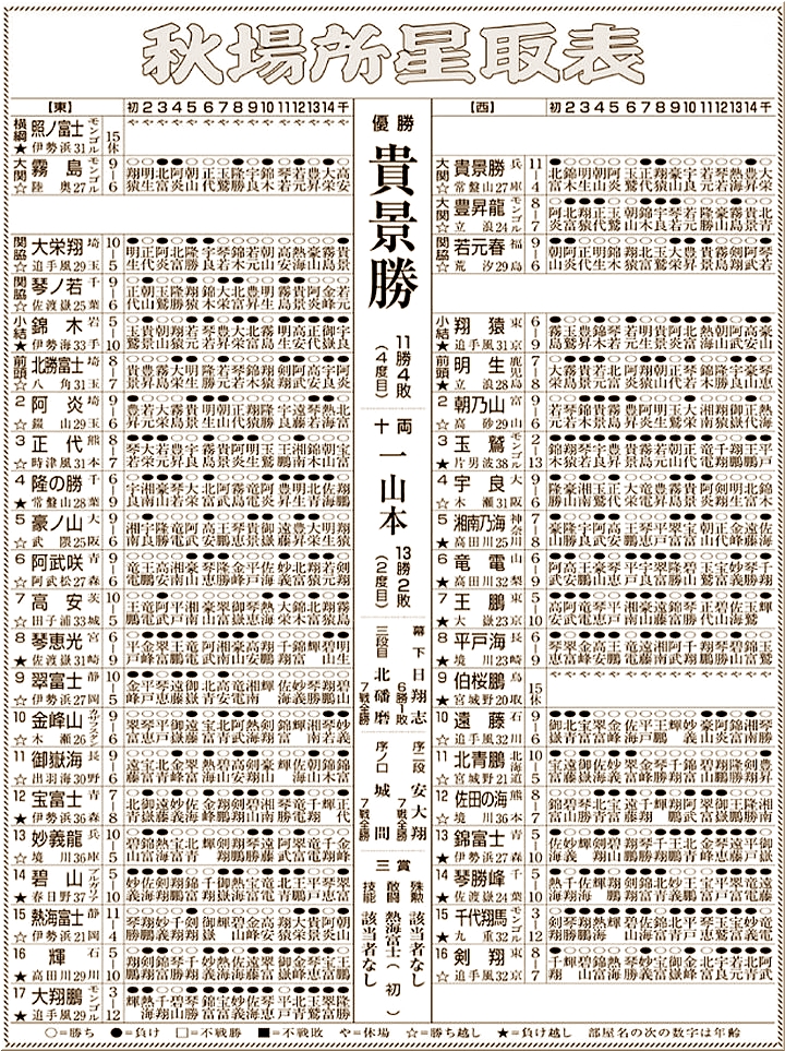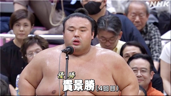 11勝4敗での優勝は、1場所15日制が定着した1949年夏場所以降4例目となる最も低い成績。九州場所(11月12日初日、福岡国際センター)での綱とりには微妙な機運が漂う。過去2度の綱とり場所は、いずれも途中休場した貴景勝。苦い経験も踏まえ「みなさんに認められて上がれる地位。2回失敗しているので『三度目の正直』なのか『二度あることは三度ある』なのかわからないけど、一生懸命やるしかない」と変わらぬ意欲を口にした。