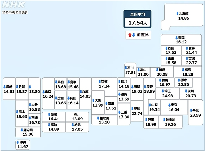 国内全体では「17.54人」で、国内・広島県のいずれも前週対比で減少推移にありますようです。