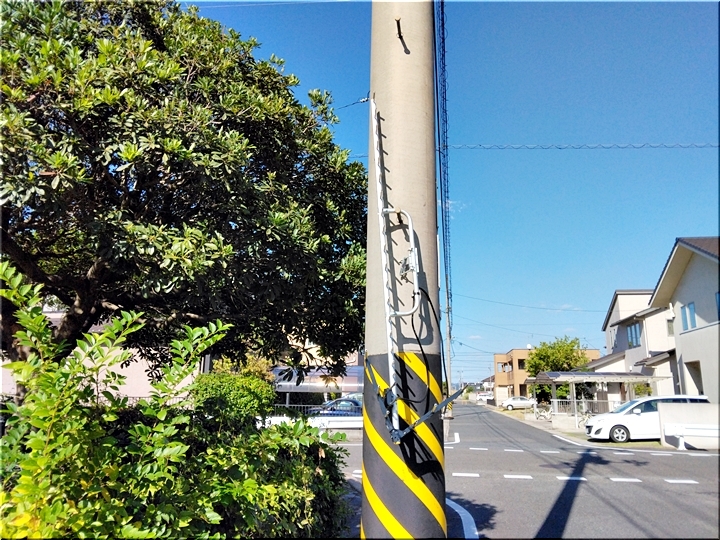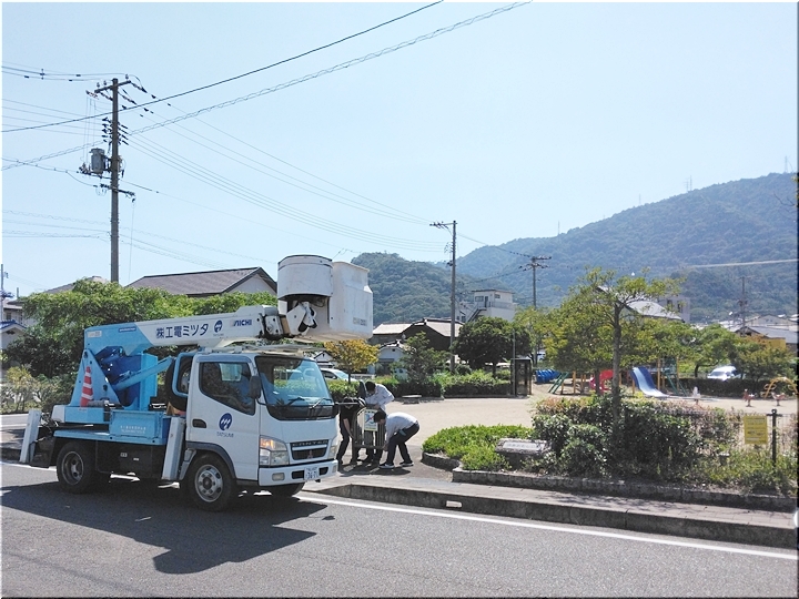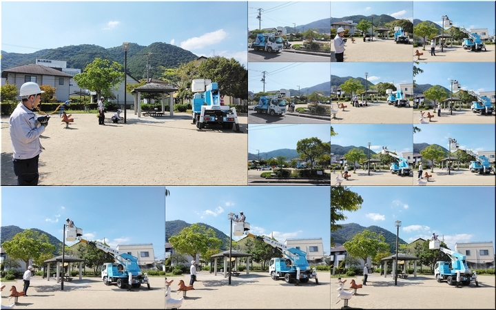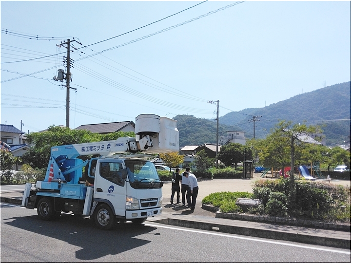 昼食を終え、一服のため外に出てみますと、近隣の公園(浜あおむし公園)横の市道に、社用車と高所作業車が来訪です。