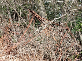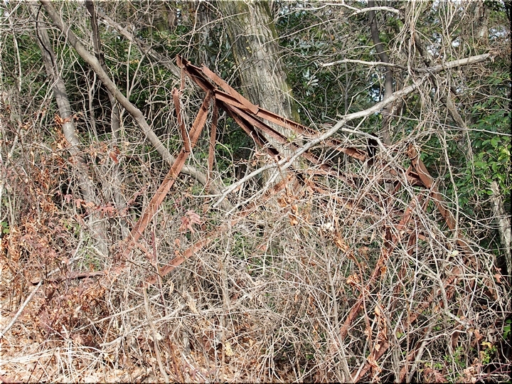 国旗掲揚台まで戻って来まして、周辺を見廻しますと、おっ、こんな所に昔懐かしい鉄塔が転がっております。ふ〜ん、老朽で腐食し倒れましたのかも…それとも、危ないから倒されましたのかも…