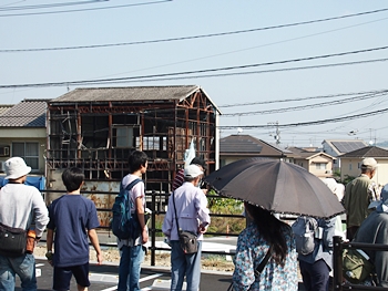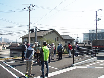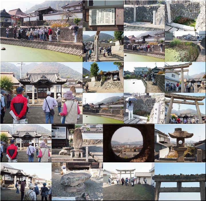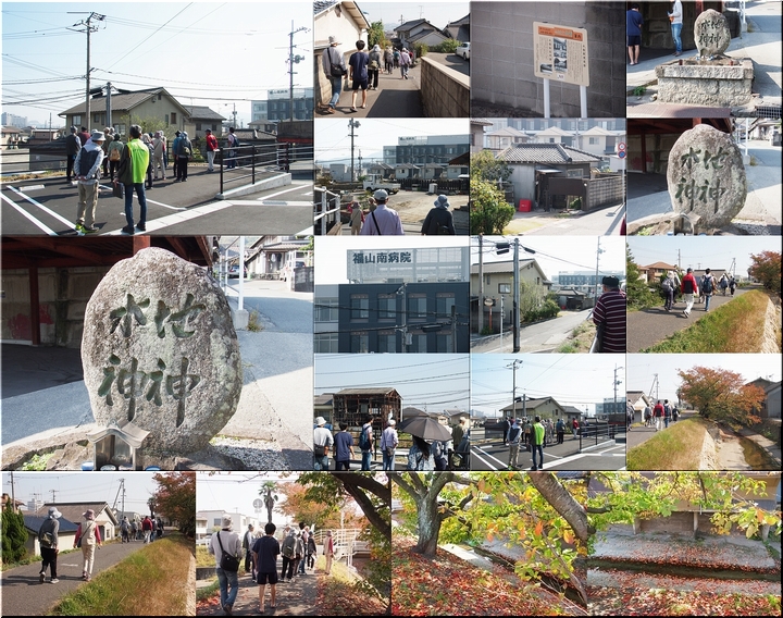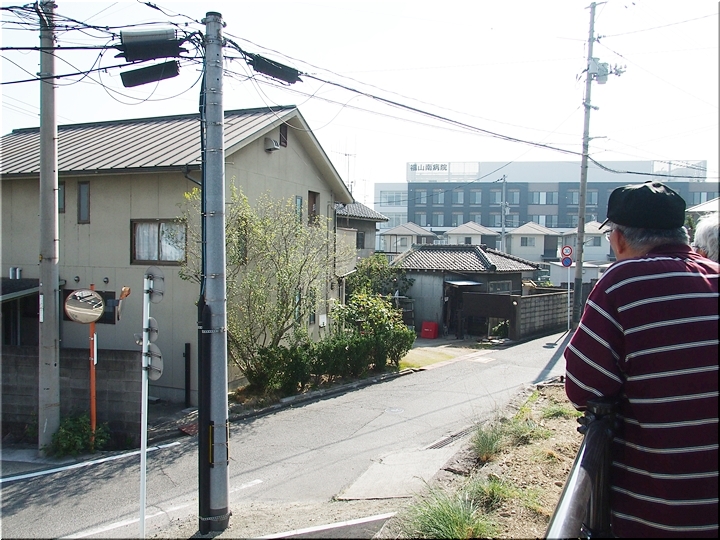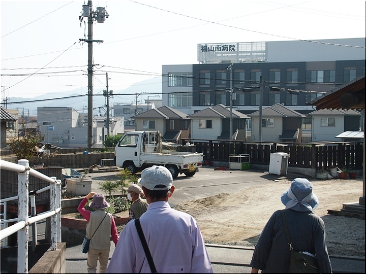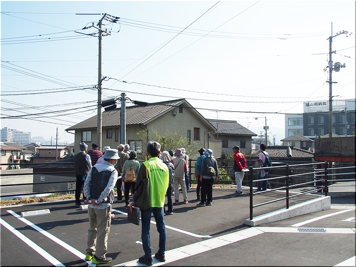 史跡巡り≠焉Aいよいよ終盤で、水呑郵便局跡・鞆警察署水呑警部補派出所跡・浜貝塚%凾フ説明は、周辺が見渡せます福山南病院sanの駐車場から行われますガイドsan。