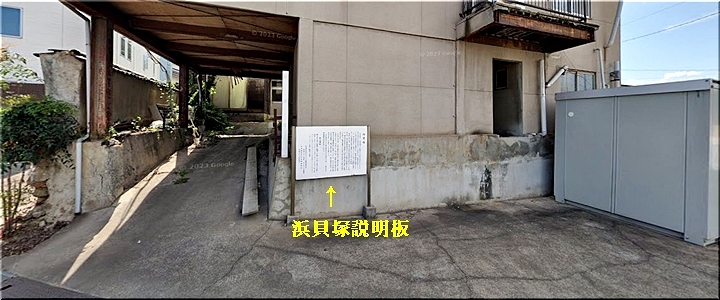浜貝塚は、県道福山〜鞆線の三叉路交差点入口から南に分岐する旧県道沿いに分布する。範囲は約70m先の道路敷地と東側及び、西側丘陵部と推定されている。現在は海岸から遠ざかっているが、当時は海岸に沿って大規模な貝塚を構成していたようだ。