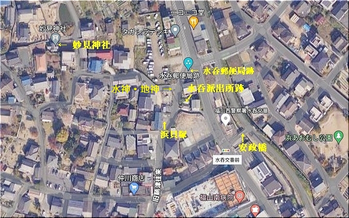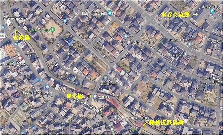 鞆街道を横切り、現在の水呑派出所前の安政橋を渡りますと、水呑川土手を南下し豊年橋≠ヨ。